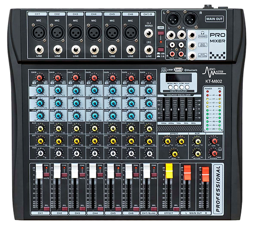 La consola Audio Master KT-M802 llega a Casa Musical La Nota para demostrar que no necesitas una mesa gigantesca para tener un control profesional. Diseñada para ser robusta y fácil de operar, esta mezcladora de 8 canales es la favorita en los valles para sistemas de karaoke, perifoneo y presentaciones en vivo que requieren conectar varios micrófonos simultáneamente con una claridad excepcional.
