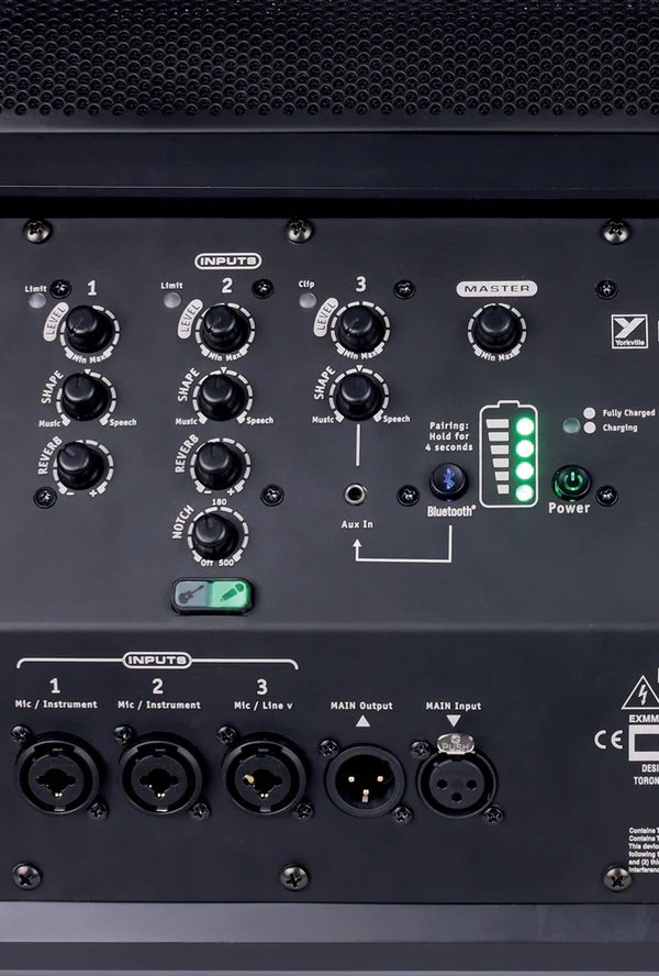 El panel posterior cuenta con un mezclador de tres canales intuitivo. Los dos primeros canales aceptan conexiones XLR o Jack 1/4″ para micrófonos e instrumentos, mientras que el tercer canal está dedicado al Bluetooth y una entrada auxiliar de 3.5mm. Con efectos de reverberación integrados, puedes pulir tu sonido en segundos sin necesidad de pedales o consolas adicionales.
